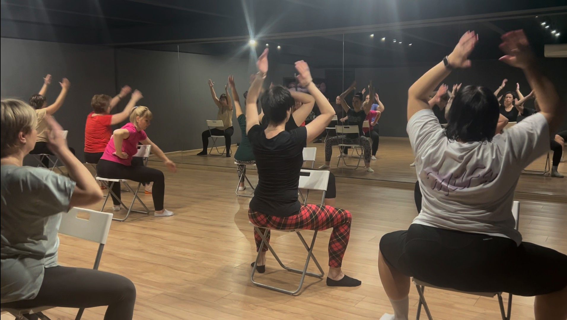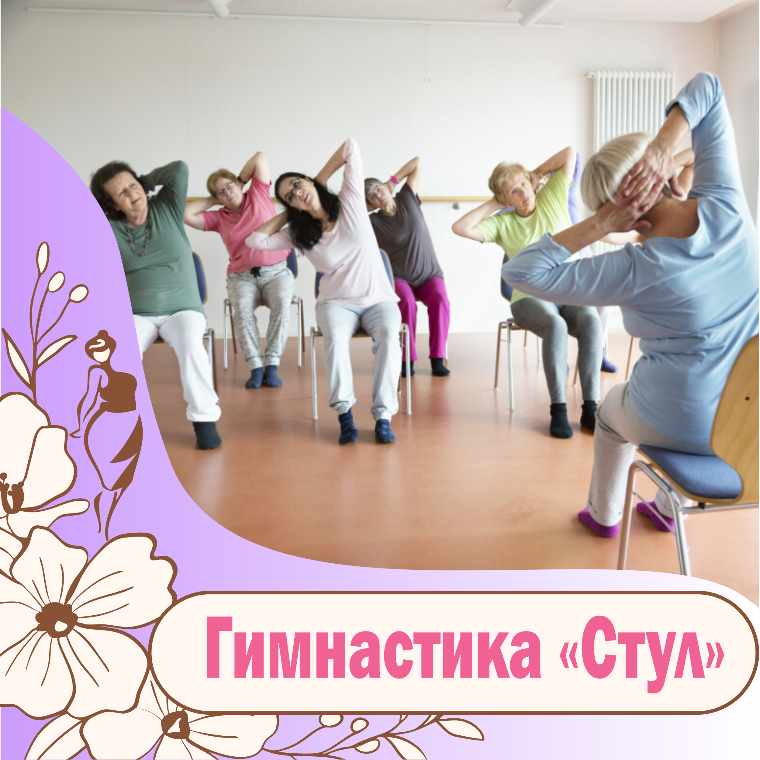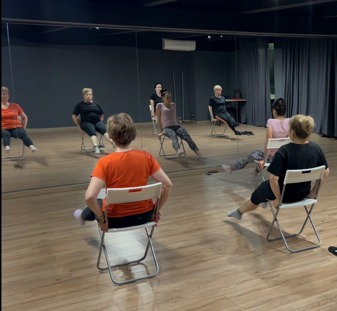 На наших групповых занятиях "Гимнастика Стул" мы выполняем комплекс простых упражнений, сидя на стуле. Это очень легко и увлекательно. Максимум пользы и позитива при минимальной сложности.
